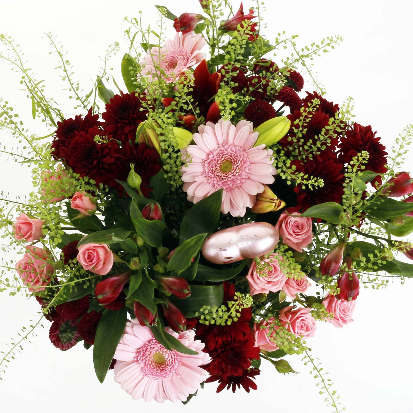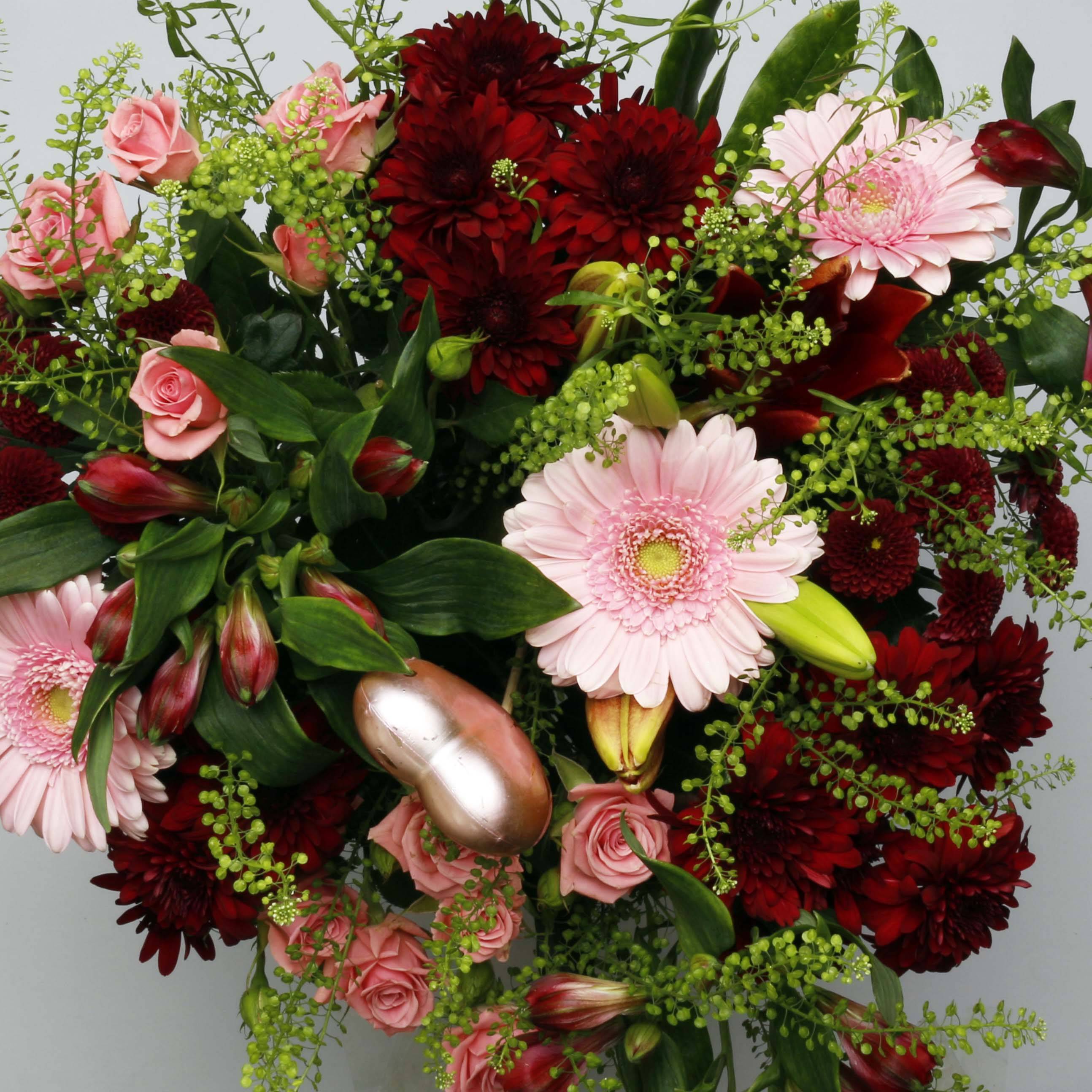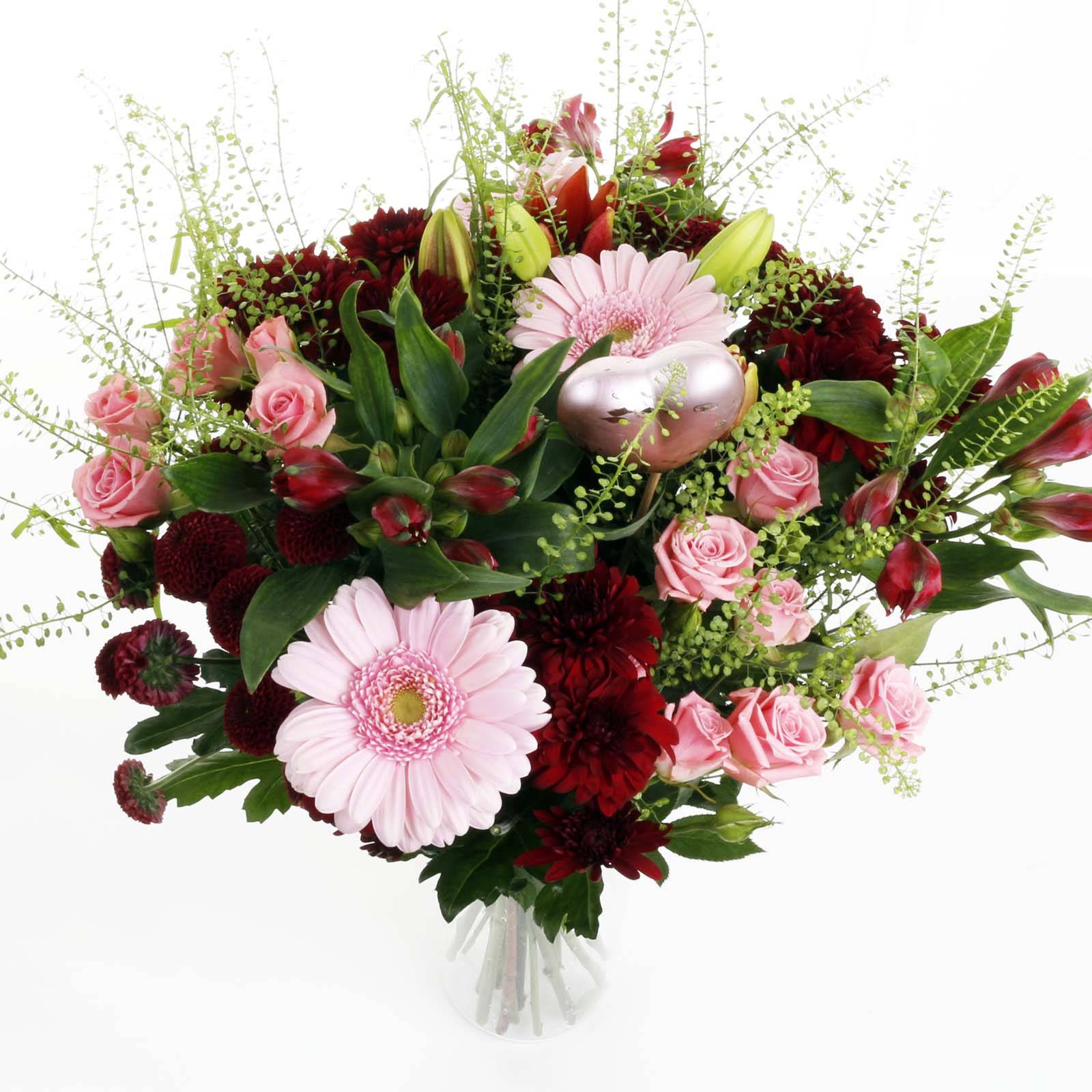 This exquisite bouquet of pink roses, red chrysanthemums, pink Germinis and more will be truly appreciated and adored by anyone this Valentine's Day.
