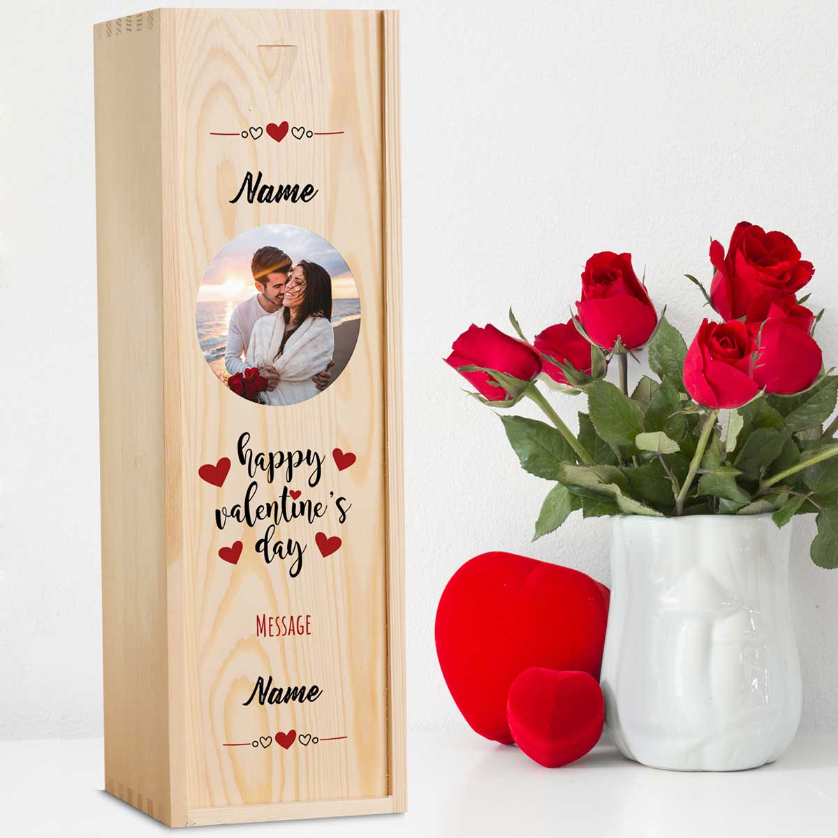 This personalised wine box with a bottle of wine makes the perfect gift Valentine's Day gift.