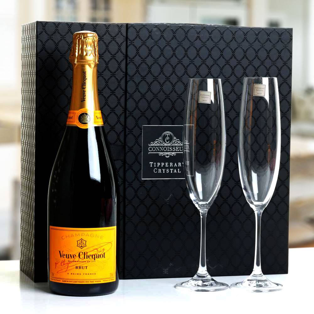 A delightful bottle of Veuve Clicquot Champagne packed in a stunning Connoisseur Gift Box from Tipperary Crystal with two accompanying glasses - great gift to celebrate any occasion.