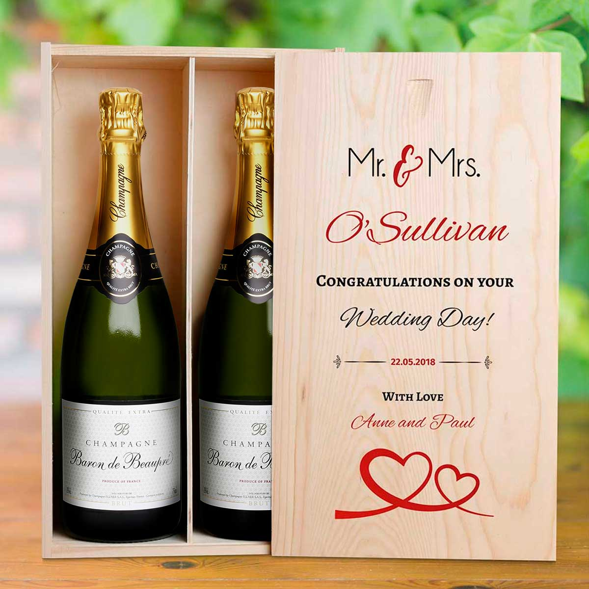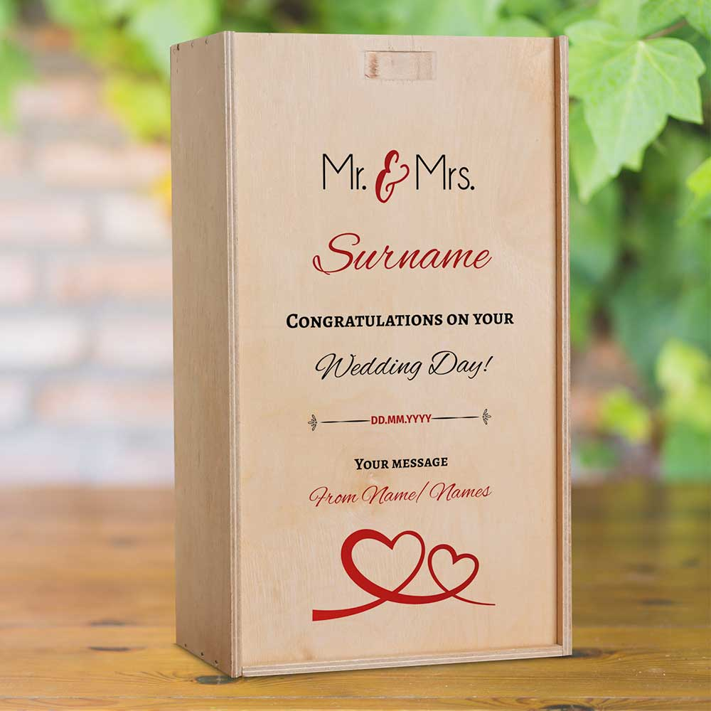 This personalised wooden box with two bottles of Champagne makes the perfect wedding gift.