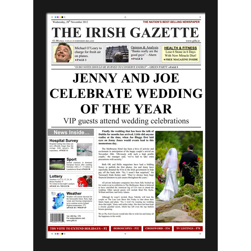 A truly novel gift, this personalised spoof newspaper cover is presented in either a tube roll or a contemporary black frame. The colourful cover comes in A3 size. You can read how the story will go underneath. To order, simply complete the personalised details and click add to cart.