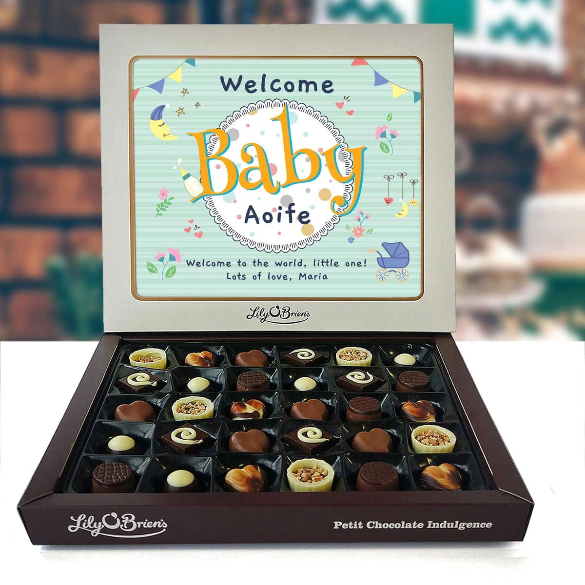 Simply personilise with the baby's name and a message and we will frame it with one of our NEW light cream photo box frames. Each frame has a subtle gold trim and a single Lily O'Brien's logo. The perfect gift of Lily O'Brien's chocolate with a personal touch!