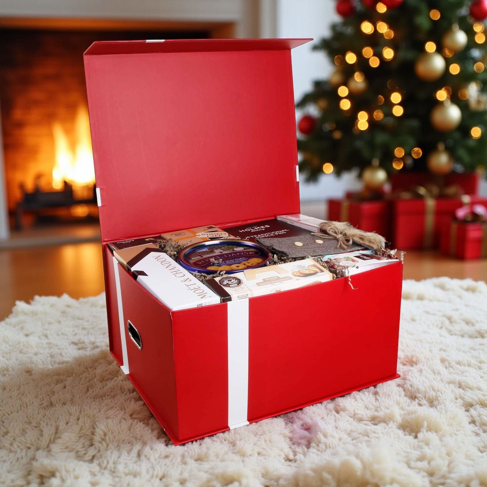 The hamper is presented in our new luxury red gift box with satin bow. Stylish and reusable, the gift box is packed inside a separate shipping box for secure transport