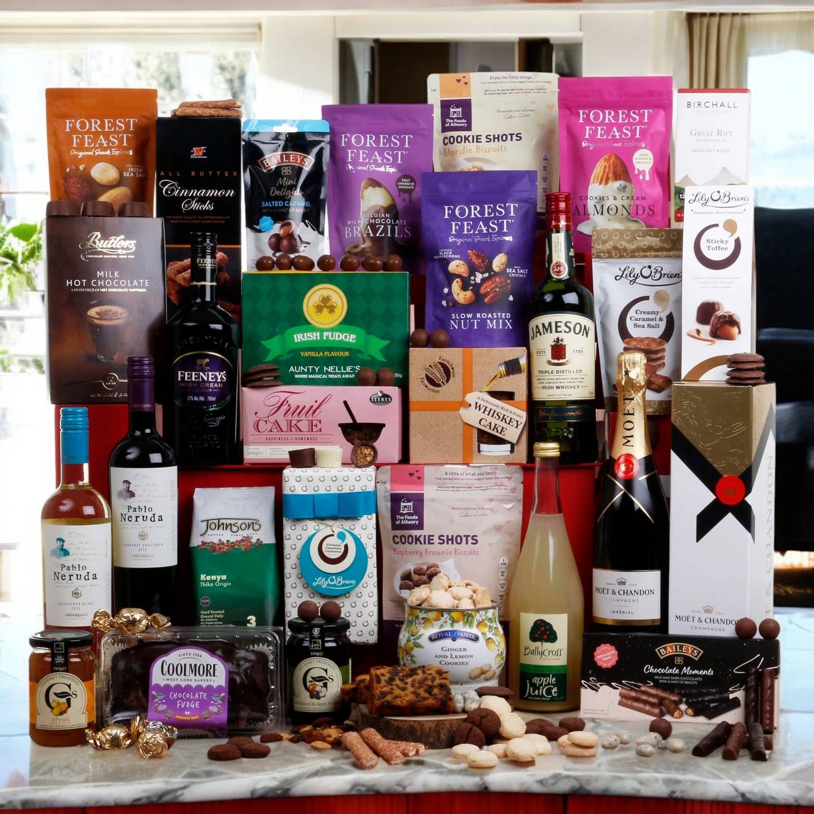 Indulge in the ultimate gourmet experience with this hamper, brimming with premium delights. Featuring an exquisite selection of artisan chocolates, rich fruit cakes, luxury cookies, fine wines, smooth Irish cream liqueur, and classic Jameson whiskey, this collection is perfect for celebrating any occasion. Complemented by fine teas, creamy hot chocolate, nutty snacks, and sparkling Moët & Chandon, it’s a gift that promises to impress and delight.