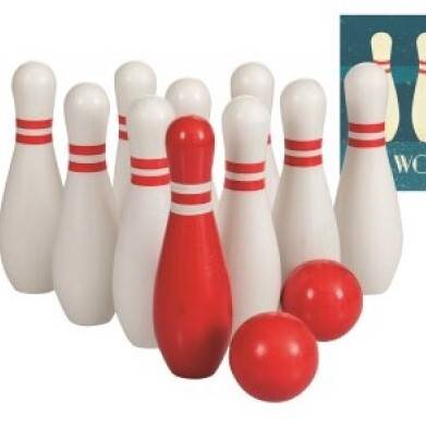 A classic to play outside with your friends. Put the wooden bowling pins upright and try to make them fall over with the ball.
