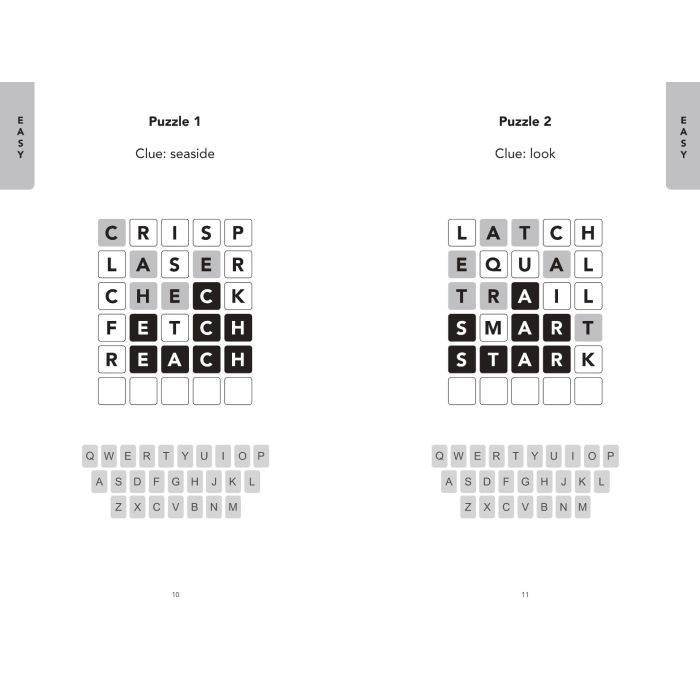 Puzzlers must guess what the correct word is, deducing from previous words in the grid what letters go where. A clue means there is only one correct solution to each puzzle, and answers can be found at the back of the book.