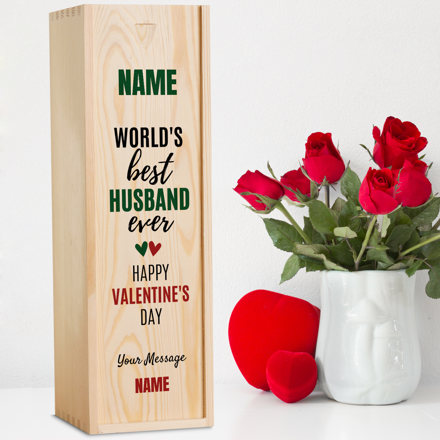 Surprise your husband on Valentine's Day with this one-of-a-kind, personalised whiskey wooden box. The sleek, wooden design features the message "World's Best Husband Ever Happy Valentine's Day" on the front, making it the perfect gift to show your appreciation for all he does. Fill the box with his favourite wine for a romantic night in together or add special keepsakes for an extra sentimental touch. This unique Valentine's Day gift is sure to make him feel loved and appreciated.