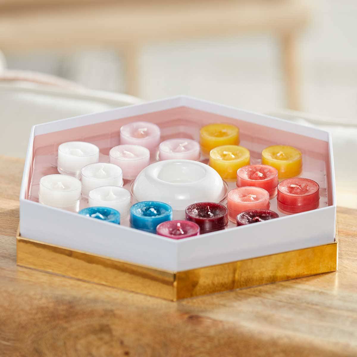 This set contains eighteen scented Tea Light Candles in Sakura Blossom Festival, Sweet Plum Sake, Mango Ice Cream, Majestic Mount Fuji, Tranquil Garden and Berry Mochi.