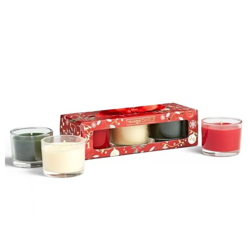 Set of three Filled Glass Votive candles with classic Christmas Yankee Candle favourite scents including Balsam & Cedar, Christmas cookie, Sparkling Cinnamon.