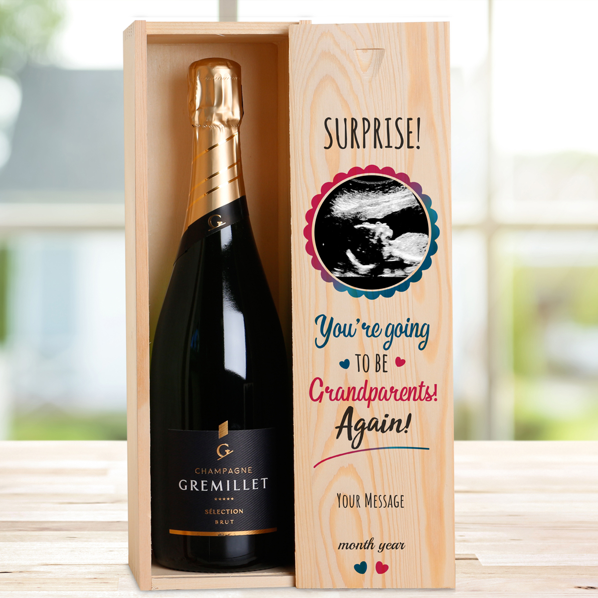 This personalised wooden box with a bottle of Champagne makes the perfect gift and a wonderfaul way to surprise new grandparents!